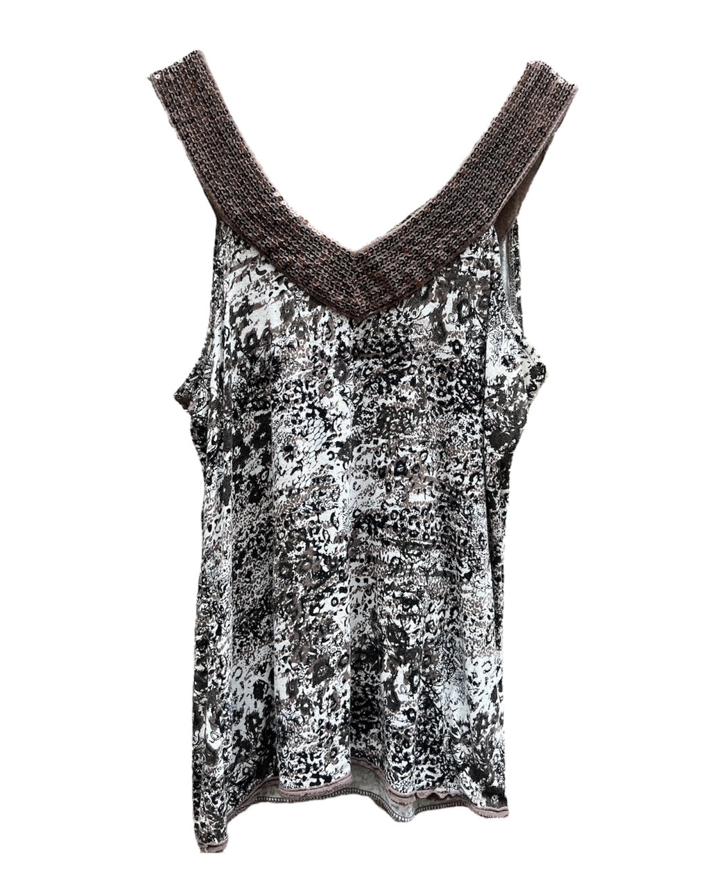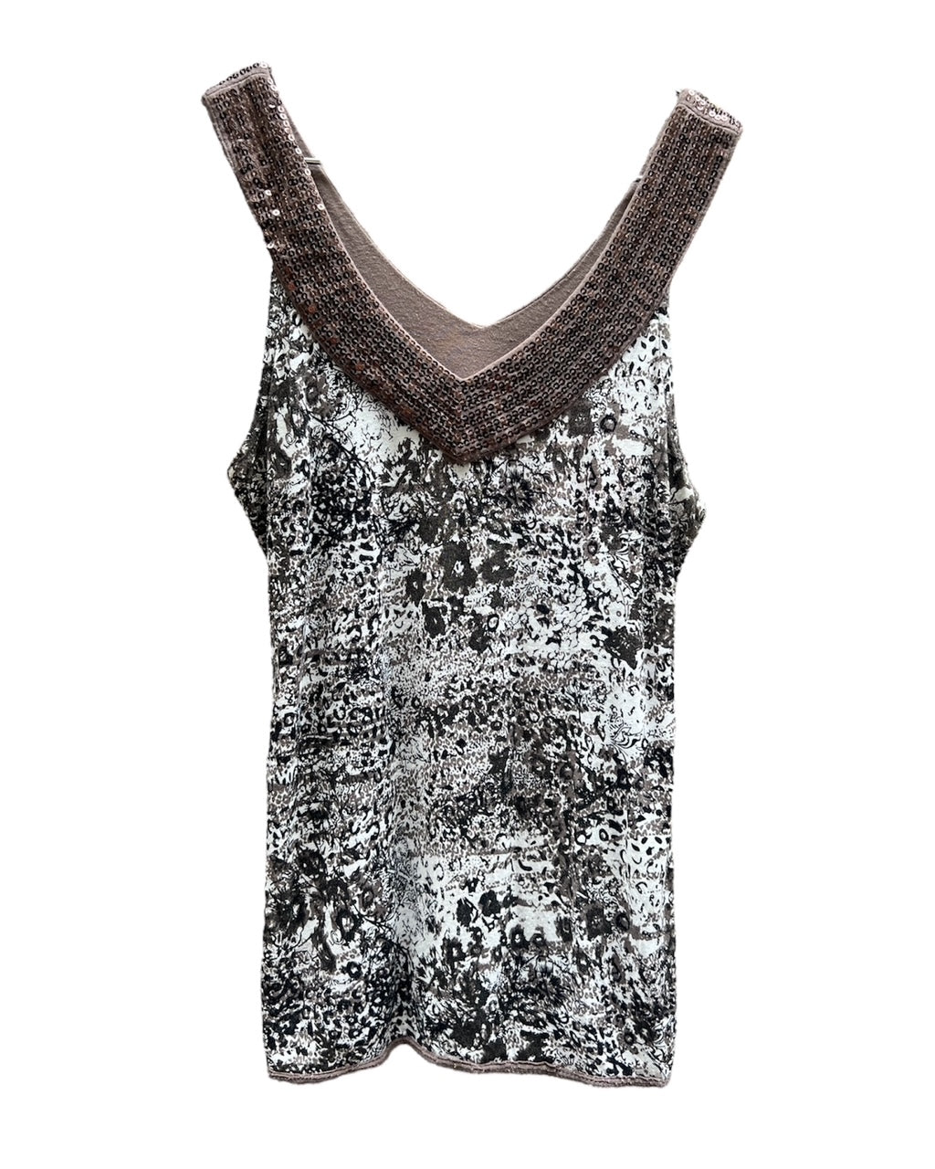 Top Y2K avec col en V marron à sequin. Motifs noirs et blanc.